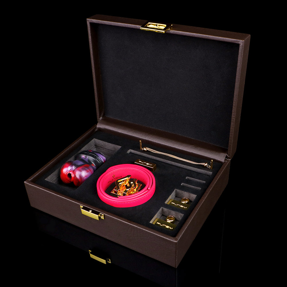 An beiden Seiten des Knebels befinden sich exquisite goldene Metallketten, die dem Gesamtdesign einen Hauch von Tabu verleihen. Das kühle Gefühl des Metalls bildet einen auffälligen Kontrast zum weichen Material des Ballknebels und sorgt für einen doppelten Sinnesrausch. Die Ketten verlaufen zu einem eng anliegenden Gürtel, der den Ballknebel auch bei längerem Tragen sicher an Ort und Stelle hält. Jedes Ziehen und Zerren kann neue Lusthöhepunkte auslösen und die Grenzen zwischen Dominanz und Unterwerfung verschwimmen lassen.