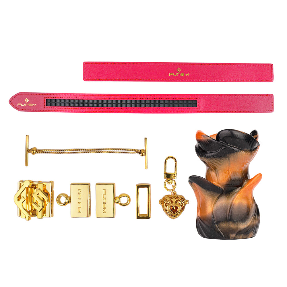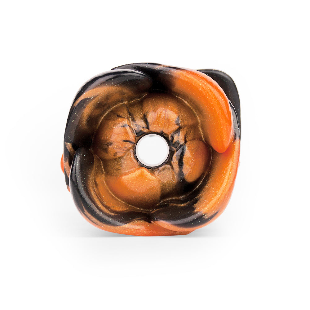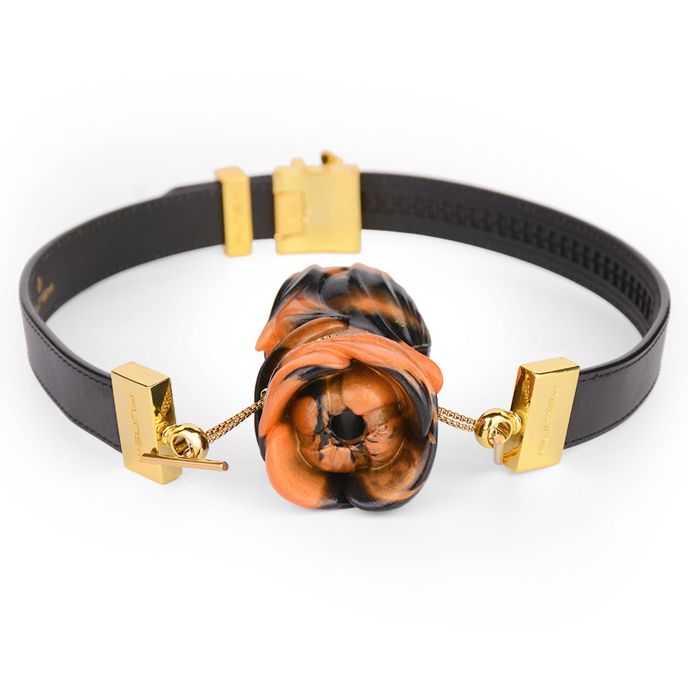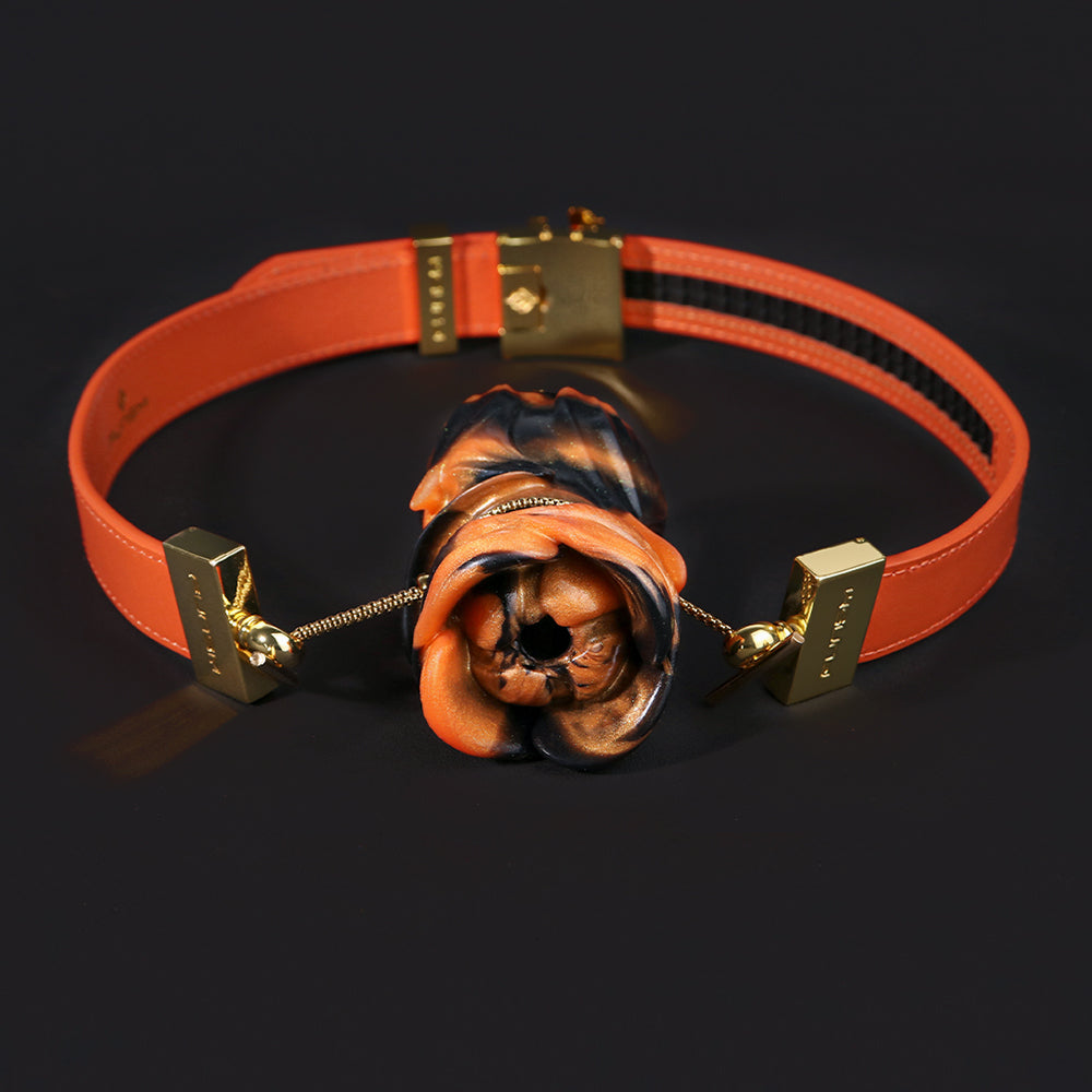 Dieser Ballknebel aus hochwertigem Silikon in einer exquisiten Mischung aus Orange und Schwarz bietet eine weiche und dennoch stützende Textur, die sich perfekt an die Mundhöhle anpasst. Die Basis besteht aus einem eleganten Lederband mit einer goldfarbenen Metallschnalle, die diesem fesselnden BDSM- Accessoire den letzten luxuriösen Schliff verleiht.