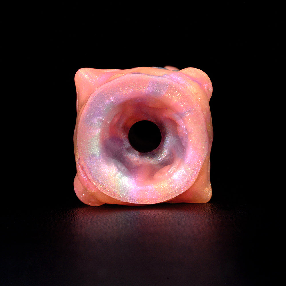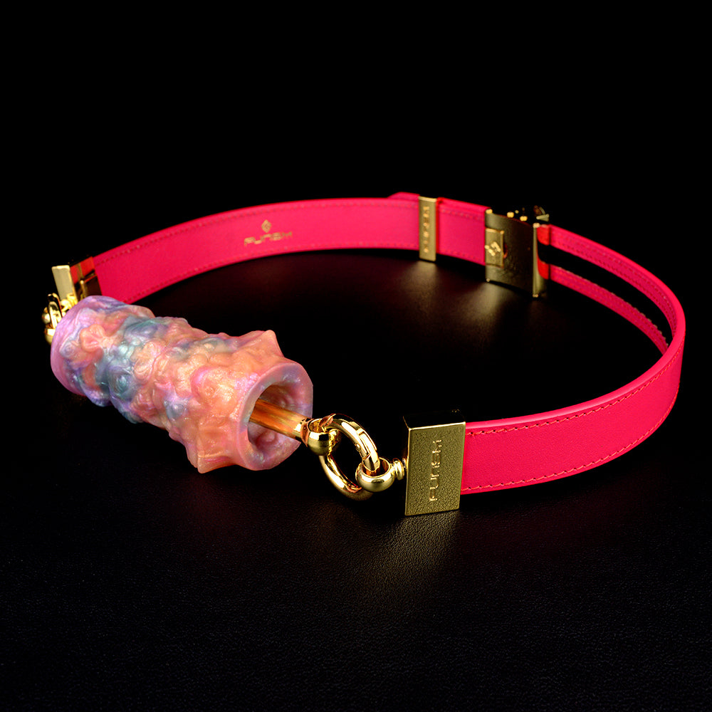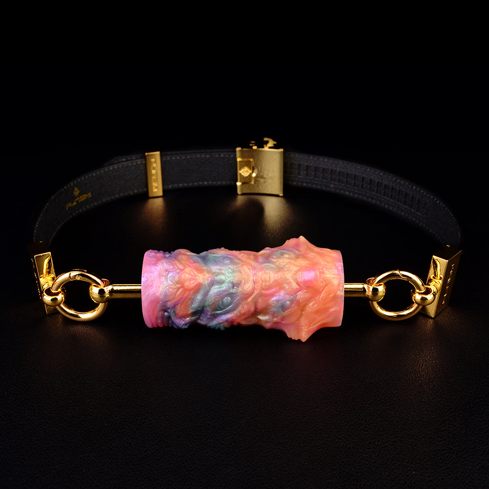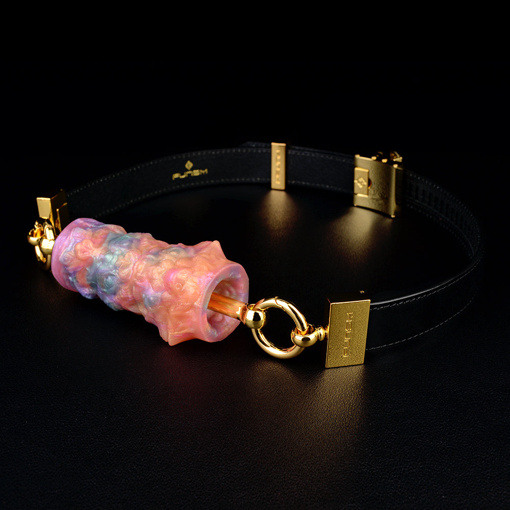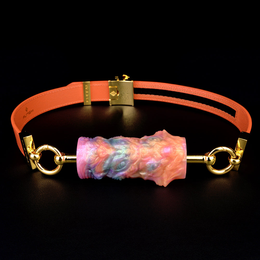Im Gegensatz zu herkömmlichen Knebeln, die oft auf kugelförmige Formen zur Fixierung setzen, erstreckt sich dieses innovative Design horizontal und umschließt die Konturen des Mundes in einer skulpturalen Form. Die ästhetischen Elemente sind sorgfältig ausgearbeitet und bieten eine glatte und dennoch dynamische Textur, die mit Licht und Schatten spielt und dem Knebel eine fast skulpturale Eleganz verleiht.