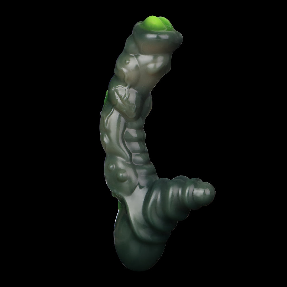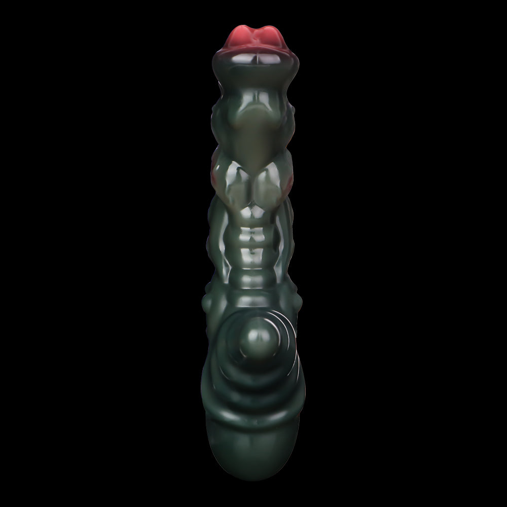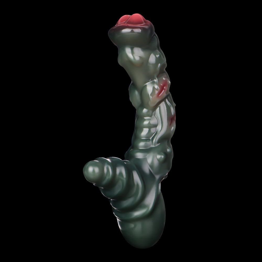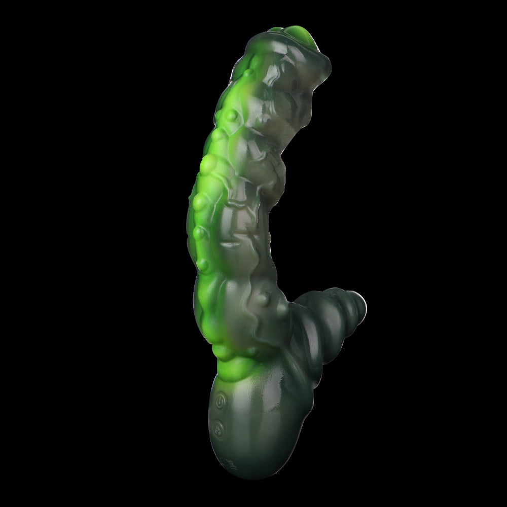 Dieser Vibrator- Dildo besticht durch sein innovatives Design mit einer tiefgrünen Grundfarbe und einer auffälligen blutroten Eichel, die einen starken visuellen Eindruck hinterlässt. Die Oberfläche des Dildos ist sorgfältig mit Blockstrukturen und gleichmäßig verteilten grünen Tastpunkten verziert, während die Rückseite mit unterschiedlich großen hervorstehenden Punkten verziert ist, die Reibung und Stimulation effektiv verstärken.