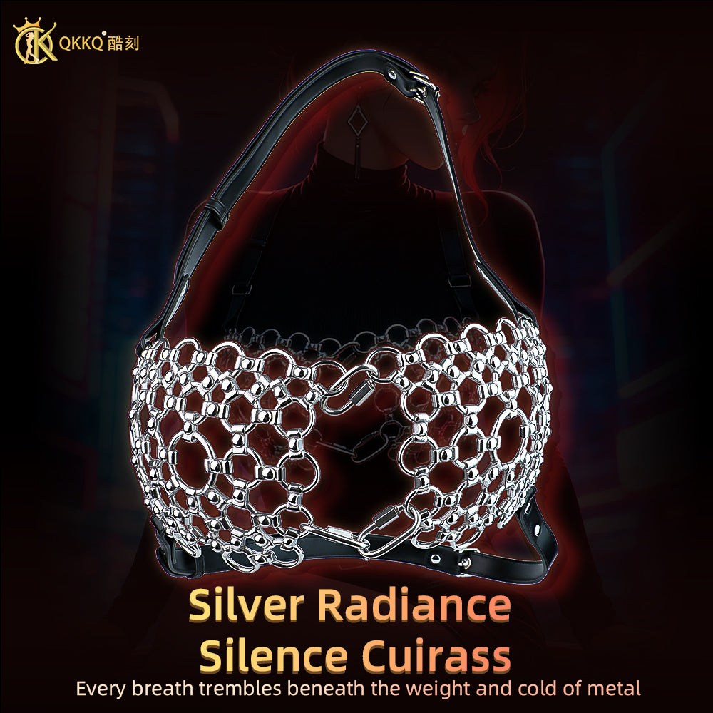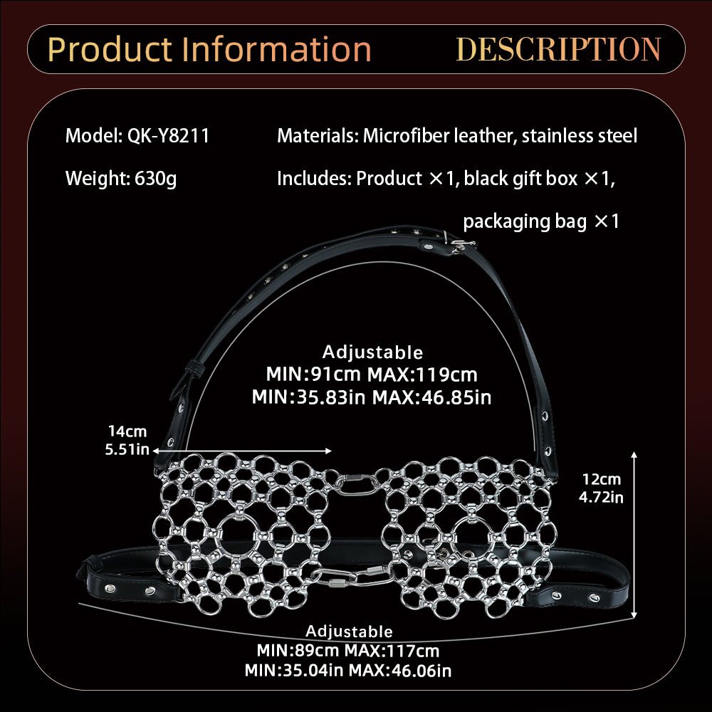 This BDSM lingerie piece combines the cold, commanding weight of stainless steel with the precise control of adjustable black leather straps. The dense network of interlinked polished steel rings creates a cage-like structure that lifts and slightly compresses the breasts, while the nipples and areolas remain completely exposed for maximum visual impact. Each ring moves slightly with your body, providing subtle, dynamic stimulation as you breathe, move, or walk.